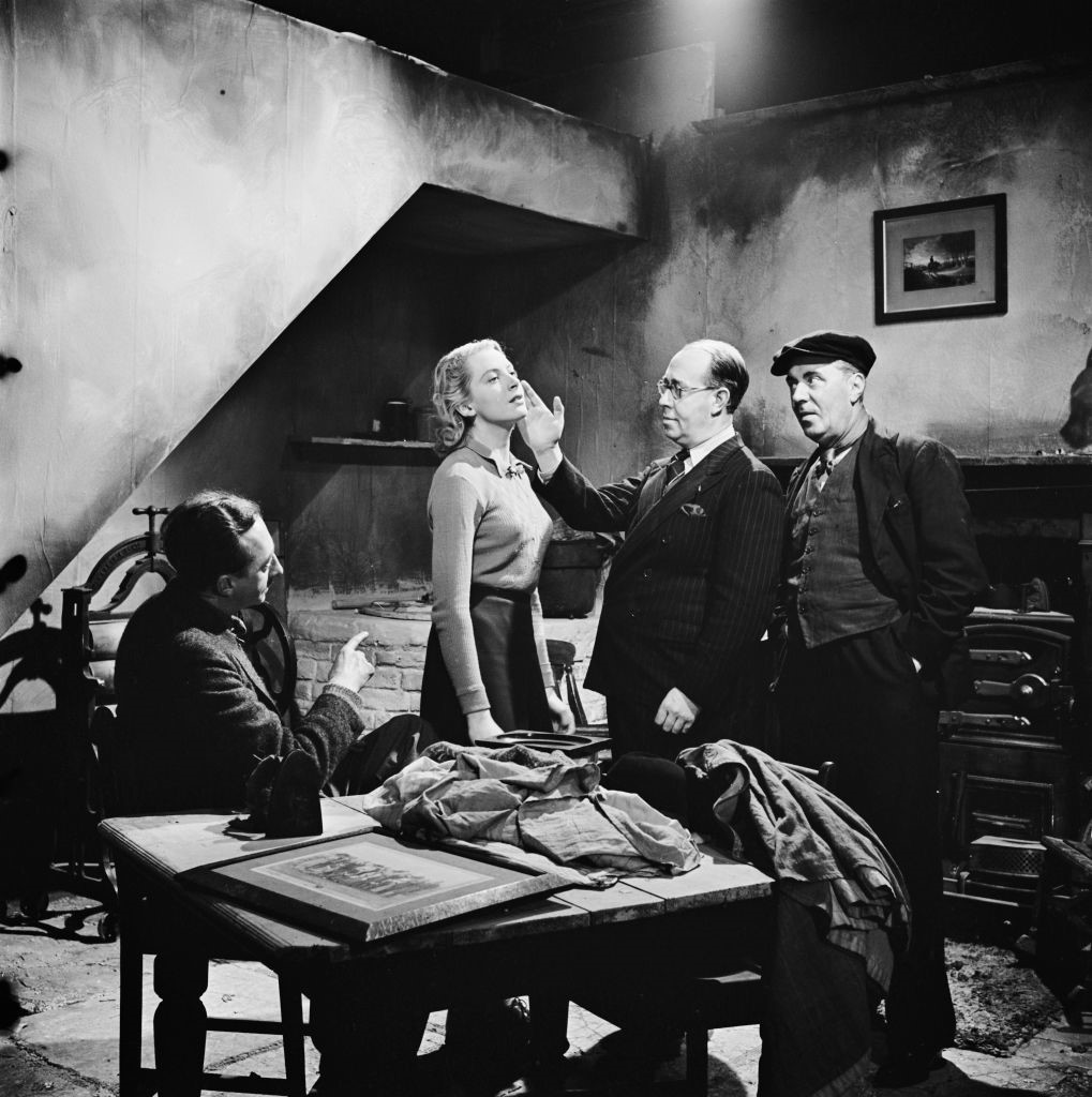 These technical possibilities certainly look as if they apply to Jarché’s photograph of a moment in the rehearsal of a scene of the film of Love on the Dole (dated December 1940). It is a striking image, which gives each of the four subjects an individual personality in that exact moment of complex interchange which in three cases sees them as half in character and half as themselves. They are all looking more-or-less relaxed, but there is a sense of tension too as there is physical contact between director and actress, which though an imitation of violence, she tenses to face. Deborah Kerr is seen half as professional actor concentrating on getting this specific moment in the performance right, and half as Sally Hardcastle in this violent breach with her father towards the end of the narrative. George Carney as actor is seen preparing to imitate the action of the director John Baxter, and the nervous half-smile may suggest he is a little taken aback by what he must do, but he is also already half in the role of Mr Hardcastle. John Baxter is the director, but for the moment is passing on his vision of the next scene by half-stepping into the role of the angry Mr Hardcastle. The author (and associate producer) Walter Greenwood is the only one of the four subjects seen wholly as himself, and he is a little remote, back to the camera, face only half-visible, but intervening in the rehearsal of this key moment through a hand gesture, which seems to suggest that some further amendment is needed still.