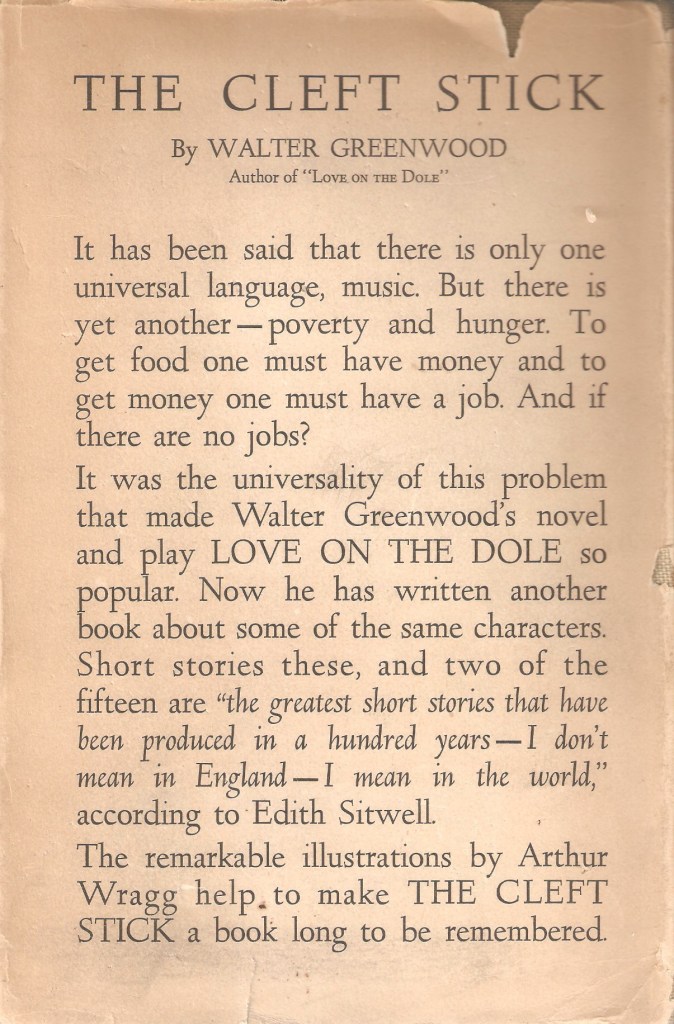 Note 2. For the only published article discussing this work by Greenwood and Wragg see: Full article: ‘The Pictures … Are Even More Stark Than the Prose’ (Sheffield Telegraph, 2 December 1937): word and image in Walter Greenwood and Arthur Wragg’s The Cleft Stick (1937) (tandfonline.com). For an introduction to The Cleft Stick, see: https://waltergreenwoodnotjustloveonthedole.com/walter-greenwood-and-arthur-wraggs-the-cleft-stick-1937/; you may also be interested in an unpublished story about poverty during the First World War, which Greenwood wrote for Arthur Wragg for Christmas, 1937: https://waltergreenwoodnotjustloveonthedole.com/walter-greenwoods-christmas-present-for-arthur-wragg-1937/ .