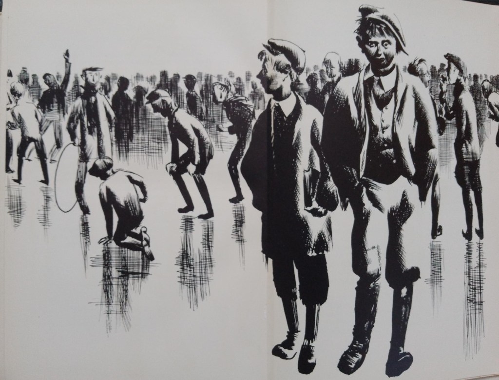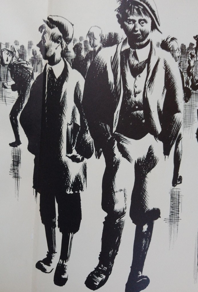 The latter years of Greenwood’s schooling were affected by the outbreak of the First World War, and by military exigencies. Langworthy Road School was commandeered as a military hospital (a role for which it surely was not well-suited) and its pupils had to share another school premises: ‘Factory idiom was introduced to the time table. There were to be two shifts’ (p.220). This led to instant territorial dispute between the school populations: