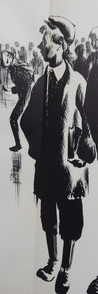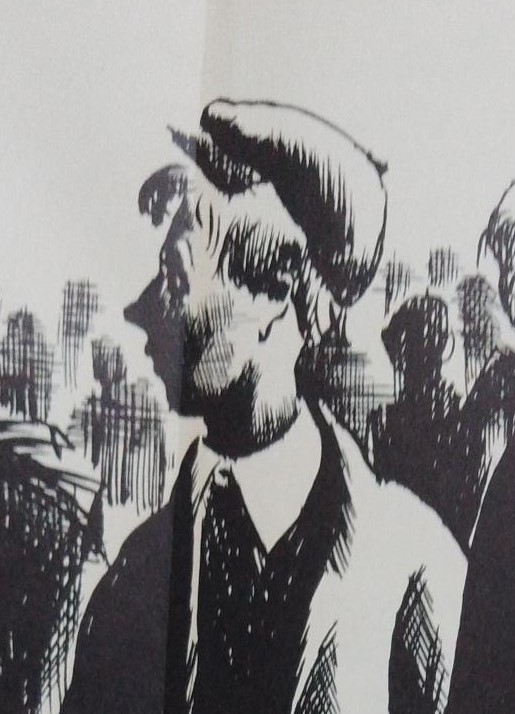 However, perhaps the most striking feature of Wragg’s portrait of Walter is his subject’s half-turn away from his companion Billy and away from the viewer. Certainly it gives the illustration a dynamism which might not otherwise be there but also creates a certain mystery for the viewer: if Walter is turning to look at the larger boy in the middle-distance with a raised arm and face is this because he is a threat or is he someone with whom Walter might actually have more affinity (or something more) but who he cannot easily join at present? Or is it that even then Walter is a keen observer of other people? We cannot know but are repeatedly invited to keep reading the fascinating image which both relates and does not definitively relate these groups of boys who form, for a while, a whole society. The schoolboy in profile, particularly the nose, mouth and chin do catch the look of the adult Walter, as I think this comparison of a further detail of the portrait and a photograph from 1934 suggests. The photograph is a scan by the Author from the original found in an early copy of Love on the Dole which Greenwood had given and inscribed to an otherwise unknown ‘comrade’, ‘Mrs Henrietta Russell’ on August 5th, 1933 (I have flipped the photo from its original orientation to give a similar left profile to Wragg’s second school portrait).