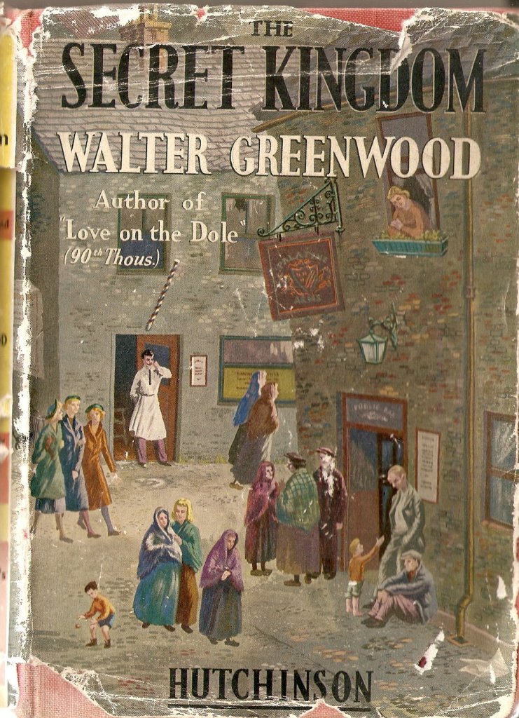 The first illustration comments wryly on the Greenwood family’s attempts to raise themselves a little in the social hierarchy of Hanky Park. This was driven by Walter’s mother, Elizabeth Matilda, nee Walter: ‘Maternal ambition was responsible for my enrolment at the Langworthy Road Council School where a “better class” of boy was reputed to attend’ (p.212). In fact this was part of a whole programme of advancement for the family for it went hand in hand with a relocation of the business and housing of the Greenwoods. (1) Tom Greenwood was a qualified hairdresser and ran a convivial barber’s shop in Ellor Street, where Walter was born. It was convivial partly because barber and clients had frequent recourse to a neighbouring pub. Greenwood returned to his parents’ early married life in his 1938 novel The Secret Kingdom. In this lively and colourful dust-wrapper for the Hutchinson 1939 reprint edition the illustrator imagines the helpful / unhelpful proximity of the barber’s shop and the Palatine Arms public house, as well as the hairdresser with fine moustaches based on Walter’s father.