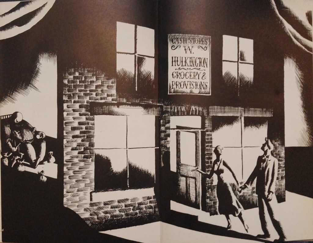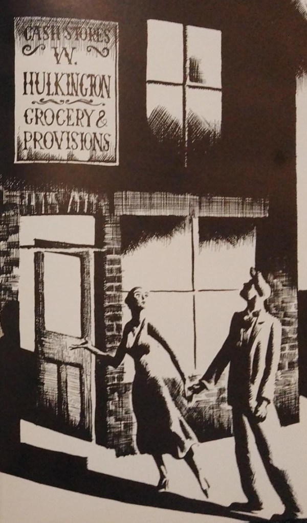 This seems just as atmospheric as Greenwood’s later version, and every detail gives not just a visual impression but tells the reader something of social significance: the knocker-up exists because no one can afford a alarm-clock, the paper blinds because no one can afford fabric ones or curtains. In contrast Mr Hulkington can afford the exceptional brilliance of electric light – and presumably he opens early to catch (or possibly ‘oblige’) the women who must come early to get what breakfast they can afford for their menfolk and children. We do not, though, get much sense of Mr Hulkington’s social origins nor his status now, though he is clearly able to run his business effectively. He has not adopted a new dress code (in Wragg’s illustration he wears no jacket but a striped shirt and a muffler) nor any outside interests nor sought local political position as far as we can see, though he has, as we shall see, acquired a lawyer and a property agent. So far, this opening is, just as in the opening of Love on the Dole, an exterior shot of the grocer’s shop, but in the next long paragraph our viewpoint moves inside the shop, giving us the interior detail of shops and shopping which we never get at all in the novel. I will not quote the whole paragraph, but enough to give a sense of the material realism which Love on the Dole does not offer in its allusions to shops: