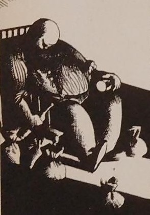 Meanwhile the human subjects of the family portrait are posed on and behind the domestic centre-piece of a sofa, women seated in front, men standing behind, suggesting hierarchy, and yet it seems rather uncertain whether standing men behind or seated women in front rank higher. The sofa does not look a very comfortable piece of furniture and both women sit very upright, with a noticeably large gap left between them. Indeed, the whole family group gives off a discrete air of discomfort: all four facial expressions seem to be under control but far from natural or relaxed. Mrs Babson disapproves of Harry for class reasons, and hence of her daughter’s projected marriage; Elsie disapproves of her mother’s marriage to Hector, and her former admiration for Hector has been replaced by intense hostility, while Harry says he never cared for Hector. Hector of course might well look nervous for he has much to conceal from everyone else in the group. Wragg portrays this unhappy family group with wonderful conciseness and immediacy. I think the illustration must be set in the sequence of the narrative before Hector’s bigamy is discovered and therefore before Mrs Babson’s wedding-gift of one shop to Elsie and Harry has been made, so the joint and unified family ownership of the business implied by their unification in the shop-sign cum heraldic badge cum family portrait is anyway somewhat of an illusion. I have not yet mentioned Wragg’s final brilliant, absurd touch: the two swans on marble pillars (or mock marble pillars?) ought if anything to signify royalty, which is definitely a claim too far, even for Babson’s High Class Fish Bars and its high pretensions.