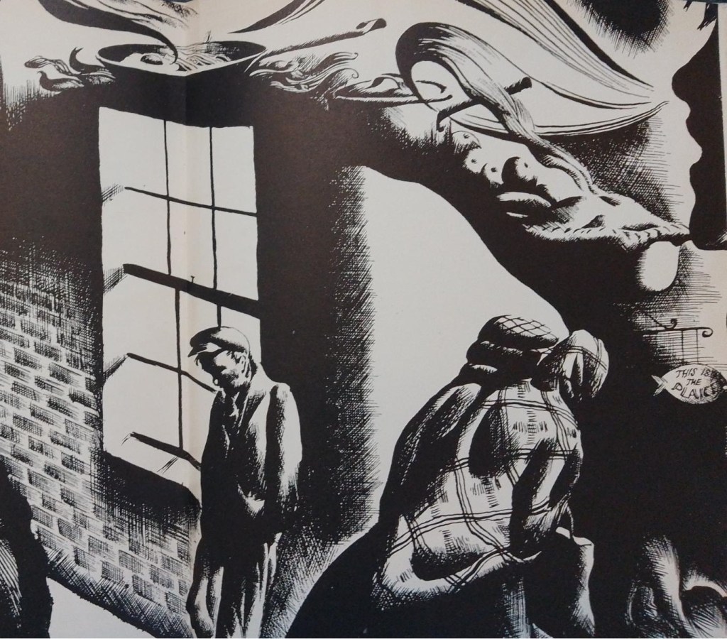 Where for the Hulkington story Wragg used a playful but highly dramatic reference to a theatrical scene, here he brilliantly combines references to three visual genres into one: the family photograph, the shop-sign and broadly the heraldic crest. As shop-sign it naturally states prominently the name of the proprietor, and in this case their self-proclaimed sense of their superior status too. It is not a fish and chip shop but a ‘supper bar’, which I take it implies it is a dining-in rather then take-away establishment (indeed we have seen Hector asking to be served food there, though his word ‘snack’ may deliberately give a sense that he at first mistakenly under-rates the place). Wragg’s placing of the actual products the shops produce in a decorative lower border may perhaps accentuate a certain pathos – no-one could claim that fish, chips, beans and peas, or even ribs on Fridays, are exactly haute cuisine despite certain claims to grandeur made in the picture (indeed, I note that cooked ribs are one of the foods referred to as offered by a handcart in Love on the Dole). Family pride is also proclaimed by the profusion of aspidistras in pots above that lower border, but that famously indestructible house-plant is more, as Orwell asserted, the badge of middle-class respectability than that of a higher or wealthier class of property-owners. The profusion of the plants (well before positive indoor jungles of house-plants were fashionable) suggest a certain visual hybridity – they are partly suggesting the kind of props favoured by studio photographers to give background to their paying subjects, though on a much larger scale than usual, but also suggest a more purely decorative work suitable to a sign or kind of modernised heraldic banner. Even the border in which the text is contained suggests two different kinds of family respectability: on the one had it may suggest grander scroll-work, but in the other it is also plainly a representation of a sign of less grand domestic respectability in the form of a brass fire-fender with its scrolled metalwork at each end.