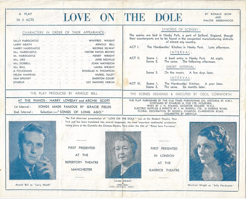 Finally, here is the programme for the one production of Love on the Dole I have so far seen – put on by the Octagon Theatre in Bolton in 2010. I enjoyed it very much and thought it an excellent production with a very good cast. The programme articles inside provide a very full and useful context for the play, and an article by Ray Speakman, the teacher and Birmingham Youth Theatre founder, who edited the Heinemann Education edition of the play of Love on the Dole (1986). However, it is my least favourite programme cover! It is a period photograph of a happy, well-dressed girl skipping, and I can’t see that this does speak to the play. I shall hope for new Love on the Dole productions and programmes to covet and jealously preserve in my turn.