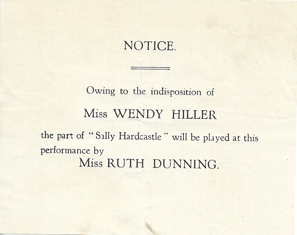 The first programme is that of the first London production at the Garrick Theatre in January 1935. I have several copies of this, and they are quite often put up for sale on e-bay UK, which of course reflects the number of people who attended that first London production, but also reflects how many preserved the programme. In fact, this is quite a full programme, with ten illustrated features which make it somewhat like a magazine, justifying its calling itself ‘The Magazine Programme’ (title registered)’. Under this title is a little motto, ‘Always Enjoyed – Never Destroyed’, which clearly encourages audience members to preserve their programmes, advice which often seems to have been followed. Indeed, like a magazine, the contents altered from month to month so that it remained topical. In January the programme cost 6d, but I note that by April the price had been reduced to 3d, perhaps because of higher sales as the play began to establish a long run. Three of my copies were annotated by their owners in fountain pen (once they got home or at the theatre, I wonder?). One is dated ‘31/1/35’ and has the comment ‘A very impressive play very well acted’. (1) The other has some dates added, showing that its owner liked the play so much that she/he went to see it twice within a couple of months – once on the eighth and once on the eighteenth of March, 1935 (both evening performances). One dated ‘September 14th 1935’ records that on that day the part of Sally Hardcastle was not played as advertised by now famous Wendy Hiller but by Ruth Dunning instead, and indeed preserved the slip inside which announced this cast alteration. In fact, The Stage had first announced in its gossip column in August that Ruth Dunning was to take over Wendy Hiller’s art for the time-being, and as it turned out Dunning had a personal history which echoed Hiller’s own sudden rise to stardom:
