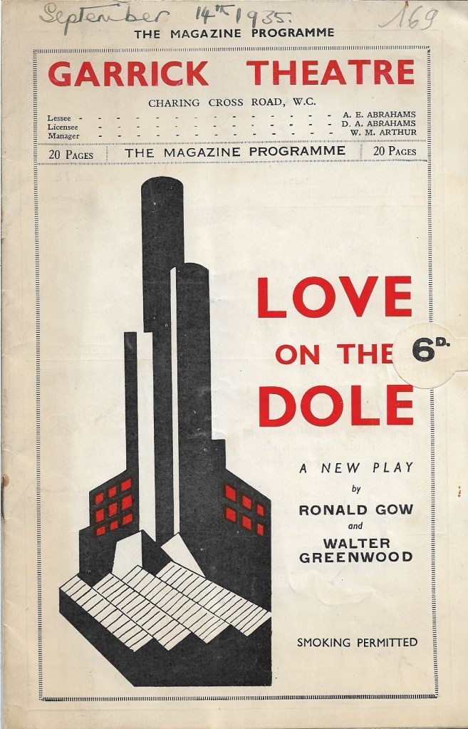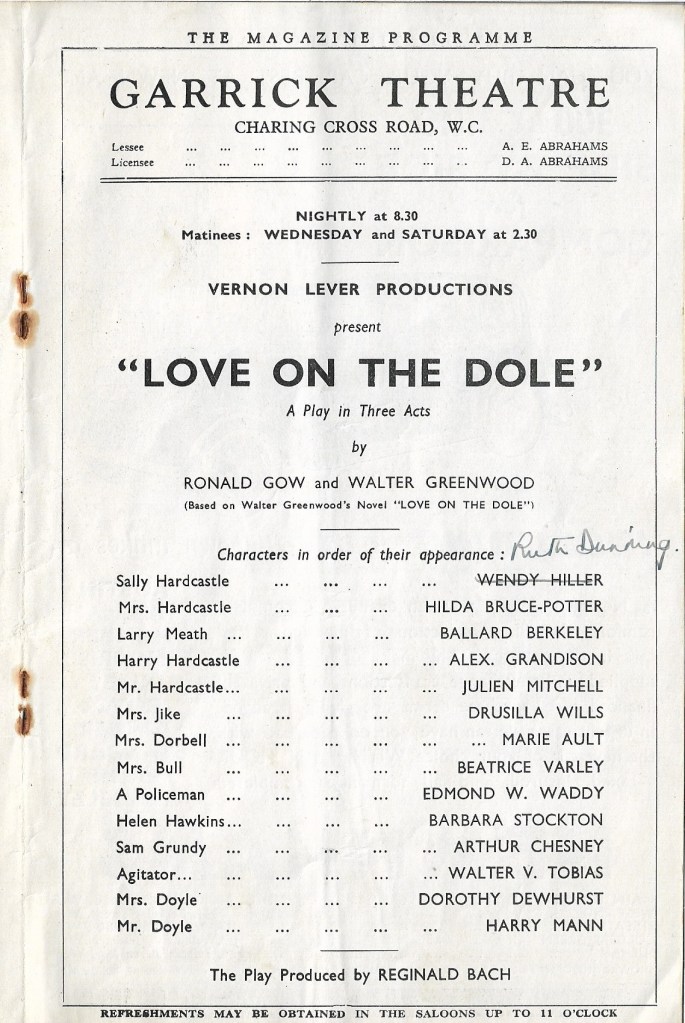 Perhaps all three original owners had a book-shelf packed with programmes each annotated, or perhaps the treatment was only for selected plays which had made a strong impression? I have a fourth copy of this programme which I found inside a copy of the Cape edition of the play of Love on the Dole – both programme and edition are signed by Greenwood, and it is dated ‘January 30/[19]35’, so presumably the owner was keen to have an autographed souvenir of the experience of seeing the play at a performance where the author was present, and indeed very early in its run.