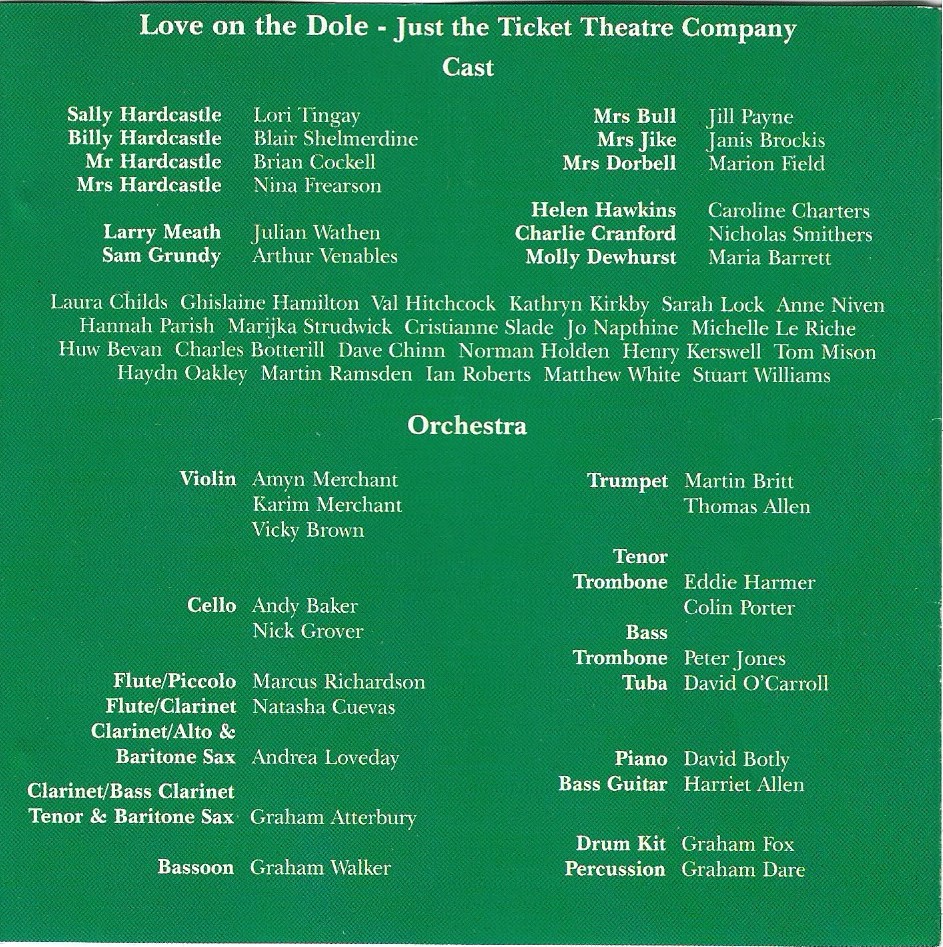 However, there was one revival of the musical of Love on the Dole of which I have at least some experience. In 1995 there was an (accomplished) amateur premiere/revival of the play at the Rhoda McGaw Theatre, Woking, by the ‘Just the Ticket Theatre Company’, directed and choreographed by Stewart Nicholls. Among many other things I am very grateful to Stewart for giving me permission to reproduce here some key tracks from the CD so that readers of this article can get a real sense of the musical and dramatic qualities of this adaptation of Love on the Dole (Stewart Nicolls of course retains the copyright of these clips).