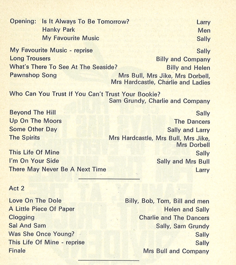Mrs Bull leads the ‘Finale’ (number 18) which is a gentler, more lyrical reprise of number 9 from Act I: ‘I’m on Your Side’. Towards the end Sally speaks to Mrs Bull, saying ‘I wish you were going with me’ to which Mrs Bull replies, ‘I’ll be with you every step of the way’ before singing a reprise of ‘Beyond the Hill’ (Act II, number 15). The whole company and orchestra conclude the show with the ‘Finale Ultimo’ (number 19) which is a further reprise of ‘Beyond the Hill’, making the final point that there IS/WAS a different, better, future life for the people of Hanky Park which has been achieved (or shall we say partially achieved?) by 1970 (and 1995).