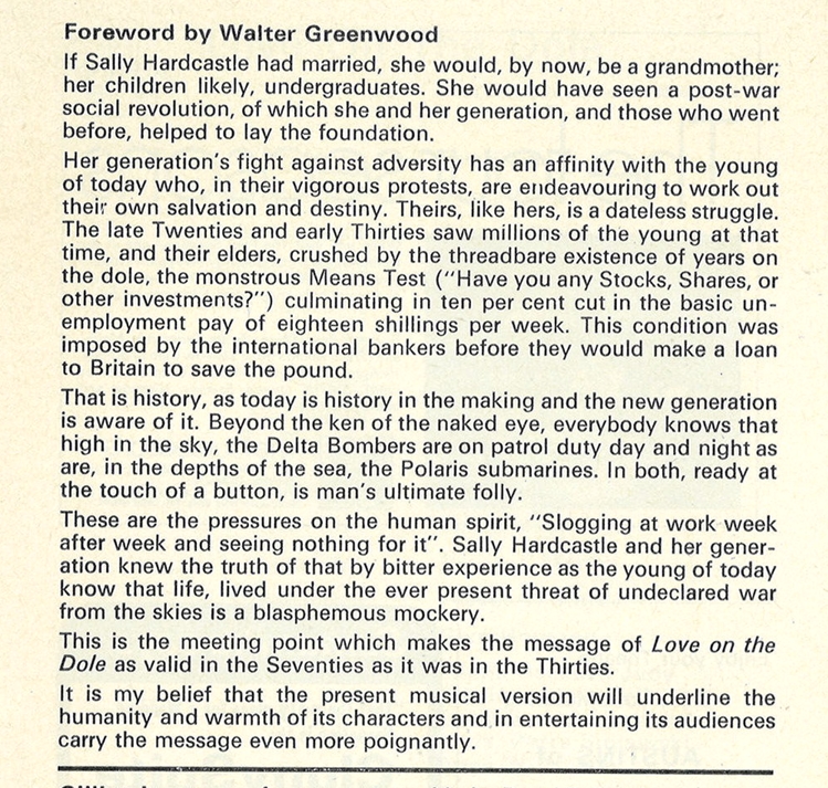 The second page had the coup of a foreword by Greenwood himself, then in his sixty-seventh year. He did not see the continuing relevance of his story at that point as so much about unemployment in itself, though he gave a concise account of that, but instead suggested that the modern context of nuclear war and MAD (mutually assured destruction) was its equivalent for young people in hanging like a blight over anything like a normal life (for a fuller discussion of this see Walter Greenwood and the Delta Bombers *). In the final paragraph he expressed his approval for the musical version as well able carry the spirit of Love on the Dole, and like its previous versions, to use entertainment to create empathy and to make serious points.
