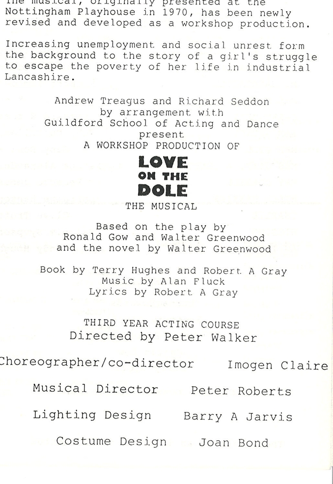 Note 2. For an account of Stewart Nicholls’ career as a director of musicals see https://narrowroad.co.uk/creatives/stewart-nicholls. I am also very grateful to him for an invaluable recent conversation via Teams on 4 December 2024 when he was able to give me a great deal of additional information about both his 1995 production and about the original Nottingham Playhouse production, as well as another 1980s production at Guildford School of Acting at the University of Surrey (a drama school curiously enough established in 1935 – the year when the play of Love on the Dole was first performed at the Garrick Theatre, London). I know less about this production but pages of the programme listing key personnel are posted at the end of this note below. In addition Stewart generously introduced me to Terry Hughes who did me the great kindness of letting me interview him over the phone from his home in Los Angeles (11 June 2025). Both Stewart and Terry recalled that Phillips Records made a sophisticated recording of the musical with the Nottingham cast, and it also had some additional songs to those sung in the actual performance. It was not released, but recordings may still exist, and if any of these ever come to light I will be delighted to add an account of their interpretation of Love on the Dole: the Musical. In the meantime I am immensely grateful to Stewart for permission to reproduce the tracks from his CD – this properly transforms a discussion only in words into a discussion in words and music, the appropriate way to talk about a musical.