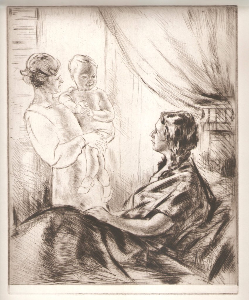 Grant’s work in all genres is now clearly highly collectable, and is frequently sold at British and US auction houses (usually fetching prices between hundreds and thousands of pounds sterling or US dollars). Several several national galleries hold examples of his paintings and drawings including the Walker Art Gallery in Liverpool, the British Museum, and the V&A. The National Portrait Gallery has four portraits by Grant, all lithographs made between 1944 and (probably) the early nineteen-fifties, and as it happens (?) all of male subjects – though Grant frequently painted portraits of women. Unfortunately (and relatively unusually for the NPG) the licensing details mean that I cannot easily reproduce any of these here, even under an academic licence. However, I do have an etching of my own by Grant titled La Bonjour, which gives a sense of his drawing style (or one of his drawing styles – his work seems to be quite varied).