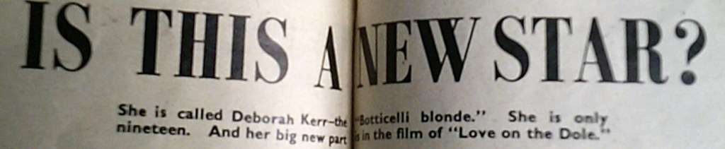 Love on the Dole was not, of course, a colour film, though Sally Hardcastle’s blonde hair is visible in black and white (and in contrast to all the stage Sallies, including Wendy Hiller and Ruth Dunning, who played her as a brunette), but Deborah Kerr’s capacity to be ‘ladylike’ and assertive were certainly brought into play. Perhaps of even more immediate importance though were her ambiguous qualities as ordinary/ extraordinary – characteristics which the Picture Post article overtly thematised, while also sometimes falling into perhaps unintended contradictions. The feature undoubtedly did its utmost to soften up a potential audience for a new star, and perhaps a new kind of star. It may have played its part too therefore in helping make a mainly serious and partly grim film about past British social and economic failure into a notable success, even in the other and freshly grim circumstances of the early war years.