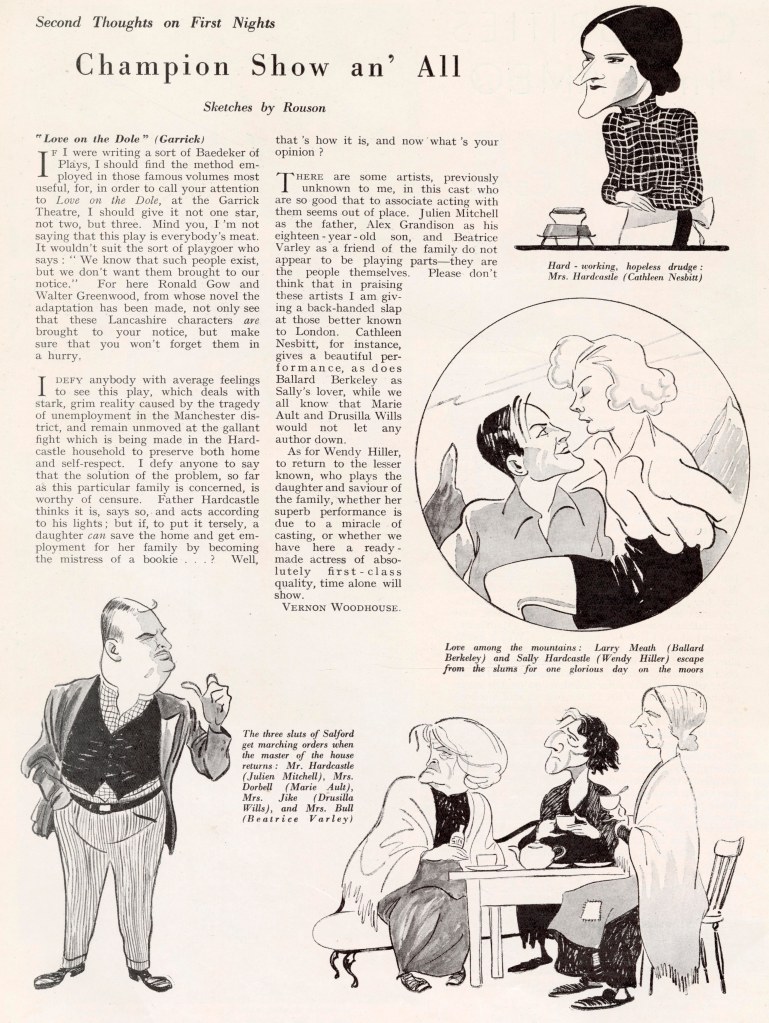 A number of papers in one way or another seem also to have been quite taken by Sally’s shorts. The Bystander had the unusual custom of accompanying its full-page theatre reviews not with photographs but with cartoon-like drawings of the central characters in particular scenes. The periodical’s very favourable review of Love on the Dole on 13th February 1935 (p.8) showed three play scenes in its ‘sketches by Rouson’: Mrs Hardcastle ironing, Mr Hardcastle throwing Mrs Dorbell, Mrs Jikes and Mrs Bull out of the house, and Larry and Sally on the moors, with her shorts and legs notably foregrounded.