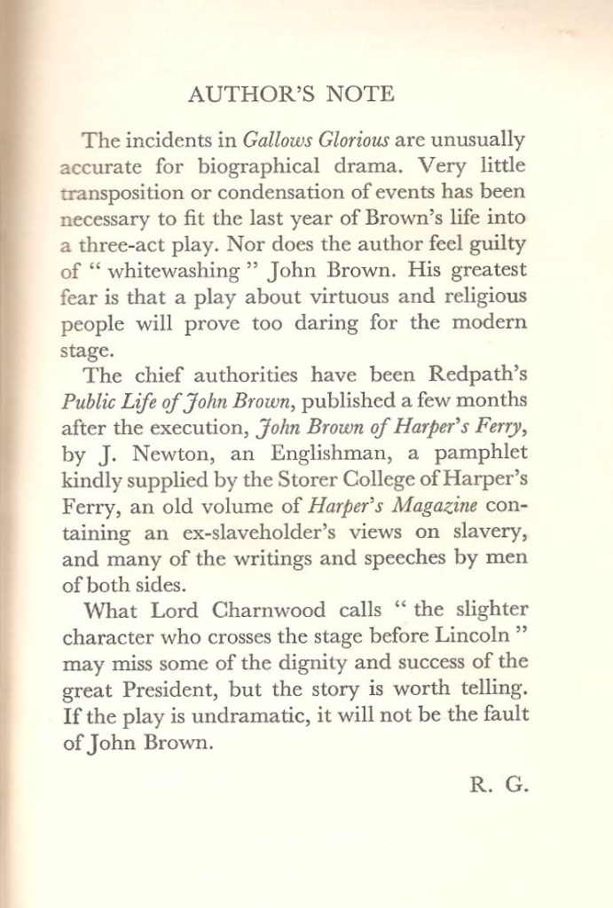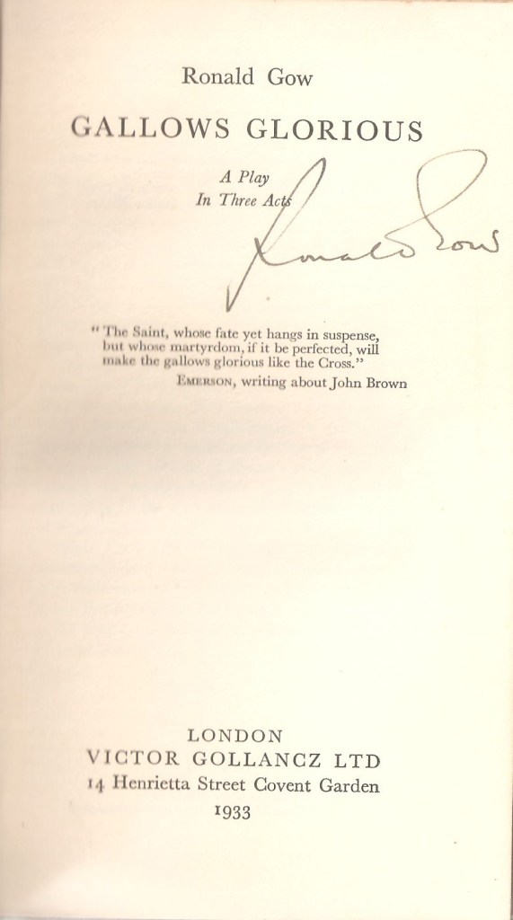 Gallows Glorious . . . is characterised by the rare qualities of depth and sincerity. It is a forceful and moving work, and London audiences are indebted to the Croydon Repertory Theatre for a production whoso success has brought it to the West End. The story relates—and if any theatrical embellishments are used they merely serve to emphasise the underlying theme – the struggle of that immortal hero of American history, John Brown, against the institution of slavery. . . . Mr Gow has given to the central figure of the play a superb dignity, and a dominating fanaticism that has yet the spirit of the visionary . It is an exciting piece. Events move swiftly, the raid on Harper’s Ferry and John Brown’s defeat, though ‘his soul goes marching on’ are essentially the stuff of drama (The Scotsman, 24 May 1933, p. 16).