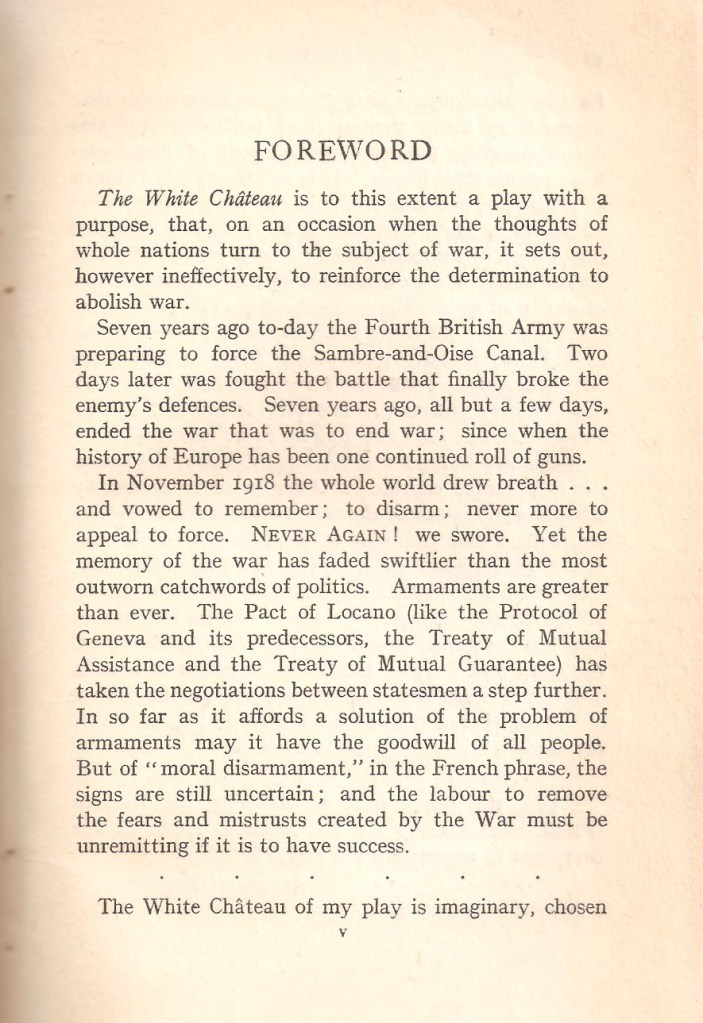 The BBC television broadcast was performed thirteen years later for Armistice Day (11 November) 1938 and went on air from 9.00 to 10.30 pm. It included ‘verses’ by T.S. Eliot, W.H. Auden, Wilfred Owen, Ezra Pound and Ceil Day Lewis (these are not in the original radio play published script, so were presumably added as a new element for the television production). Though relatively few people had televisions at this point, the broadcast seems to have had a considerable impact. Some considered the play in its various forms a significant anti-war play (‘classed among the best plays of the century’ reported the Yorkshire Evening Post on 17 November 1934, p.5), and the Foreword (below) clearly makes a claim for the seriousness of its intent to reinforce post-war support for the refusal of another war. The initial radio version was certainly seen as being a success, the Dundee Courier writing that ‘it proved so popular in that medium that it was decided to write a stage version for the West End’ (25 April 1927, p.8).