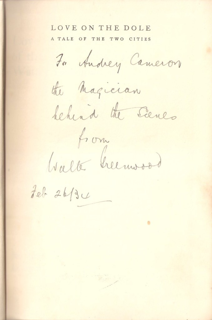 Audrey Cameron (1905-1985) had a varied career as an actress, stage-manager and then BBC producer between the nineteen-tens and the nineteen-sixties, as we shall see at the end of this article, where she will get pride of place. Her contribution to the first production and performance of the play adaptation of Love on the Dole was as the stage-manager. It was clearly an occasion which she regarded as a special one, worth celebrating with a unique spontaneously signed copy of Greenwood’s novel in its first edition and fourth impression. It is signed by Audrey Cameron herself, by Walter Greenwood and the co-author of the play Ronald Gow, as well as by (almost) the entire cast of thirteen (or fourteen) actors, and the producer, Gabriel Toyne (though this term then referred to what we would now most usually call the director).