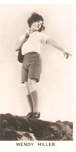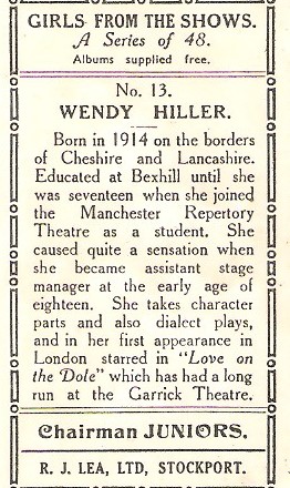 Hiller was honoured in 1935 (though the series title is dubious!) with this cigarette card. The text gives an accurate and concise account of her career so far, while the image shows her in the scene in Love on the Dole where she goes rambling on the moors with Larry Meath ((Act II, Scene 2). For further discussion of this artefact see: Love on the Dole: a Second Cigarette Card (1935).