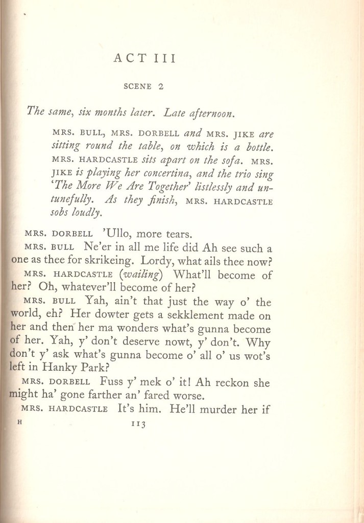 The stage direction (‘the trio sing “The More We Are Together” listlessly and untunefully’) makes clear the ironic use of this explicitly cheering and convivial song. Despite the concertina accompaniment and the ensemble singing of the three women they are not exactly in accord – neither with each other because they are always in competition, nor with the mood in the Hardcastle household at this point in the play, when Mrs Hardcastle weeps at the thought of Sally becoming Sam Gundy’s ‘housekeeper’ in his house in Wales, and very alarmingly fears that Mr Hardcastle may murder Sally when he hears. The three women try to persuade Mrs Hardcastle (each in their own style) that this is a good outcome for her daughter: Mrs Dorbell takes her usual view that acquiring some money is always good, however earned, Mrs Jike enjoys her gin and cannot see why Mrs Hardcastle won’t take a nip too, and Mrs Bull gives her more thoughtful (if hard to take) view that getting away from Hanky Park after Larry’s death will do Sally good and no harm, and that if she stayed she might become suicidal. In the context, Irving King’s very jolly and life-affirming song seems brilliantly unsuitable, but presumably instantly regained audience attention after the scene break, and created an immediate sense of tragi-comic discord and irony.