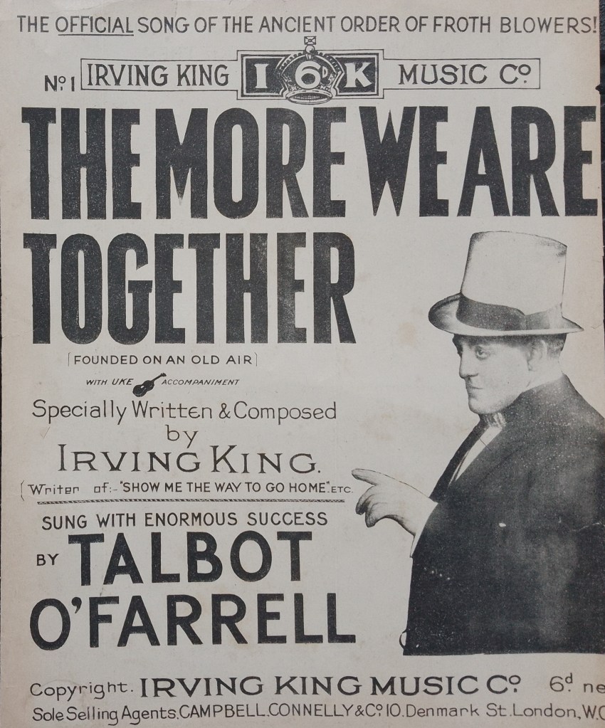 The second (‘secular’ rather than political) song of the play comes right at the beginning of Act III, Scene 2 (French p.63, Cape p.113), and has no precedent in the novel. It again involves the three older woman, often referred to in reviews but never in the play itself, as the ‘chorus’, and also again follows a certain number of nips of gin by all three. Unlike the case of the first song in the play, there is no doubt about the lyrics, tune or composer of the second song. It is ‘The More We Are Together’, ‘Written & Composed’ (though ‘founded on an old air’) by Irving King in 1926. This was something of a hit in the mid-twenties, particularly as sung by (an apparently) Irish singer called Talbot O’Farrell (he had re-invented himself as an Irish singer in 1912, though born in Hull, and having performed in a Scottish persona as Jock or Will McIvor since 1902). Here is the cover of the sheet music (with accompaniment for piano or ukulele) published by the Irving King Music Co. and crediting O’Farrell’s success with the song: