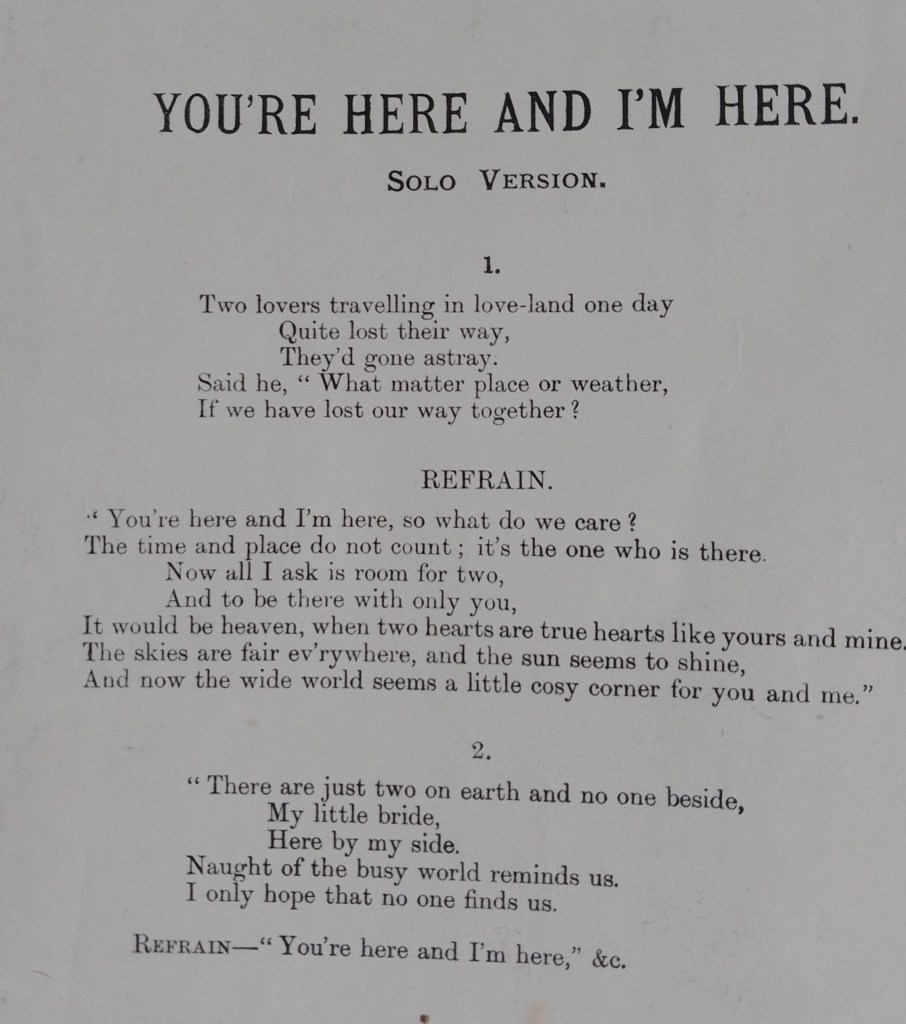 The lyrics given are the refrain to a Broadway musical hit of 1914, properly titled ‘You’re Here and I’m Here’, with words and music by the very successful American songwriters Harry B. Smith (1860-1936) and Jerome D. Kern (1885-1945). It originally formed part of the musical The Laughing Husband, though in Britain also appeared in a revue called The Passing Show. (4) There were sheet-music editions of the song, and, as so often, YouTube gives us a version of the song, though this time not from a 78 recording from the time but a more recent though very much in period-style performance: