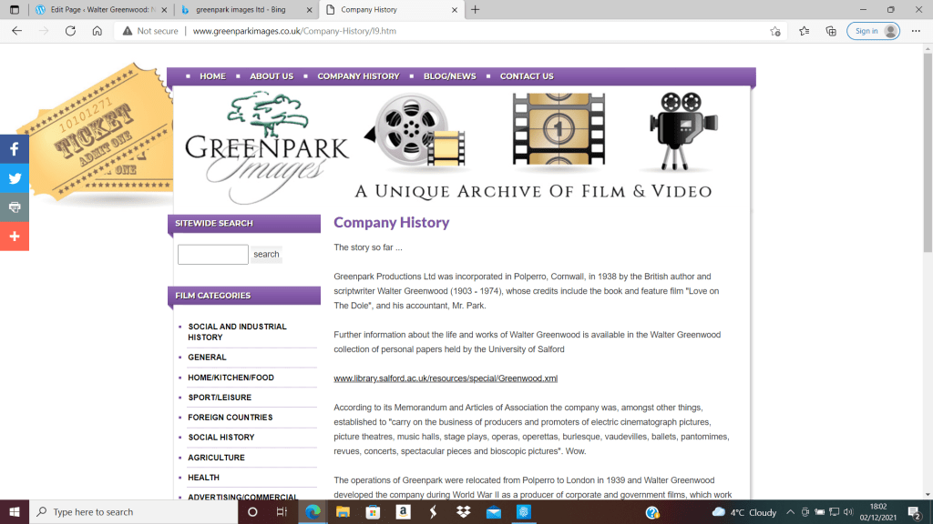 Evidence of what Greenwood himself was doing in Polperro over several decades is discontinuous, and mainly comes in intriguing fragments from press-stories or interviews with the writer, who continued to be regarded as something of a celebrity from the thirties on until the fifties. The first evidence about his activity there is connected to his co-founding with his Salford political colleague James Park of a film production company, Greenpark, which he incorporated while in Polperro, as Tovey notes (p.167). A notice with financial details and a (standard) description of the company’s scope was posted in the Stage on 22 December 1938 (p.14):
