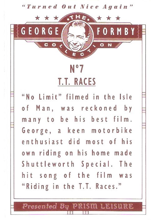 Dean agreed a contract with Formby ‘under which he would make eleven films between 1936 and 1941’, of which No Limit was to be the first. (6) It was directed by Monty Banks who in the same year also directed the Gracie Fields’ film, Queen of Hearts, for ATP. No Limit was Formby’s first really successful film, and his first proper feature film with a full story-line. It made him into a star and was a commercial success, so the contribution of the story by Greenwood may be seen as significant. The story is about George Shuttleworth (played by Formby), a chimney-sweep whose leisure-time obsession is motorcycle racing. His greatest wish is to ride in the world-famous Isle of Man TT (Time Trial) Races, but he fails to persuade the (fictional) Rainbow motorcycle company to sponsor him as one of their official competitors, and so instead has to rebuild an old Rainbow machine into what he names the Shuttleworth Snap.