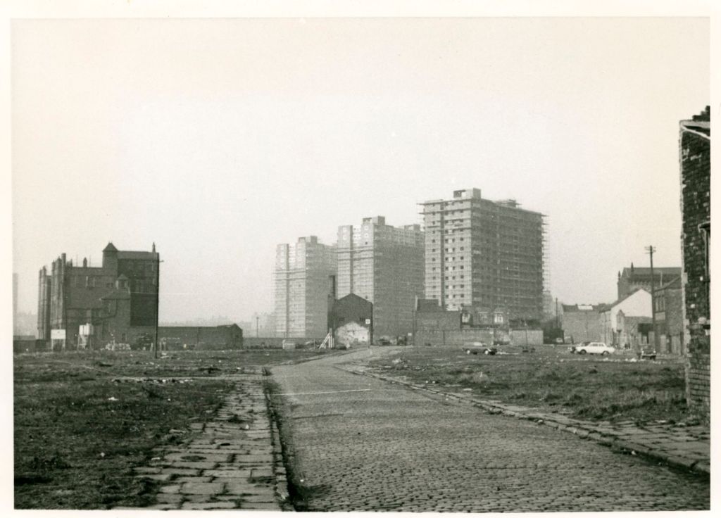 As early as 1954, the Manchester Evening News headlined an article, ‘ “Skyscrapers” to Go Up Soon?’ (16/11/1954, p.5), though in fact the detail of the report explained that Salford Housing Committee was in dispute with the Ministry of Housing about the dimensions of each unit in the blocks (the Ministry wanted less generous provision, but a Committee spokesman told the paper that ‘it was against our policy to reduce standards’). By 1958, the Manchester Guardian could confidently announce in its headline: ’15-Storey Flats for Salford – a New Hanky Park’ (30 August 1958, p.10). In 1958 the same paper published a letter which shows that progress was being made on the Ellor Street site, and that at least one Manchester citizen approved of the mainly high-rise redevelopment policy being adopted in Salford, which they contrasted with the mainly low-rise policy in Manchester: