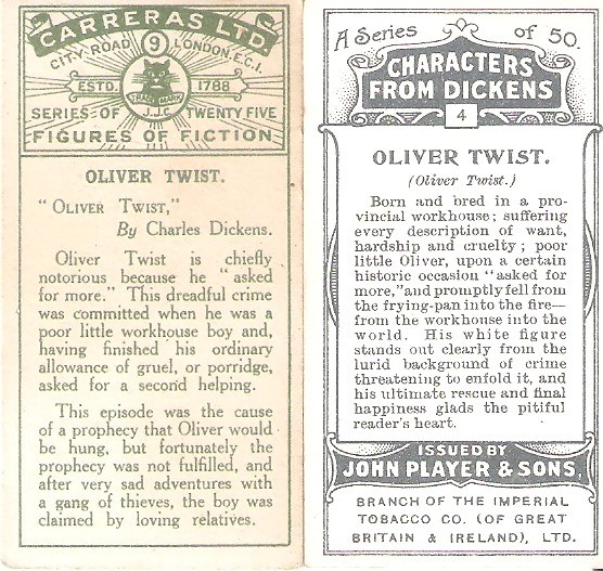The workhouse is often most readily associated with the eighteenth and nineteenth centuries, including with Charles Dickens’ critical representation of the workhouse in Oliver Twist, (serial 1837-1839, novel 1838), a novel still of course being read in the late nineteenth century and into the twentieth century by quite a wide range of readers, and which was remembered in popular culture, as in these cigarette cards. They focus on one of the most memorable episodes in the novel, when Oliver asks in the workhouse if he can have more gruel. As we shall see further on in this article, food was a big issue in the workhouse, and Greenwood and his characters often call the workhouse ‘the Grubber’, which highlights its role in feeding (in some sense) the desperately poor.