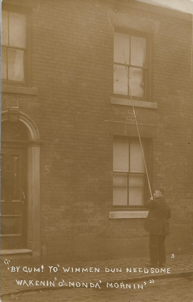 Joes Goes Home. Old Joe, who wakes – or ‘knocks-up’ – everyone for work at dawn each morning with a wire-tipped pole is ill and told he must go to the Infirmary: he and all his neighbours know he will die there.